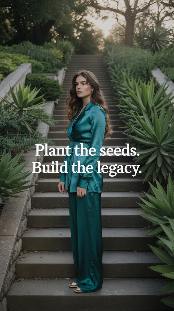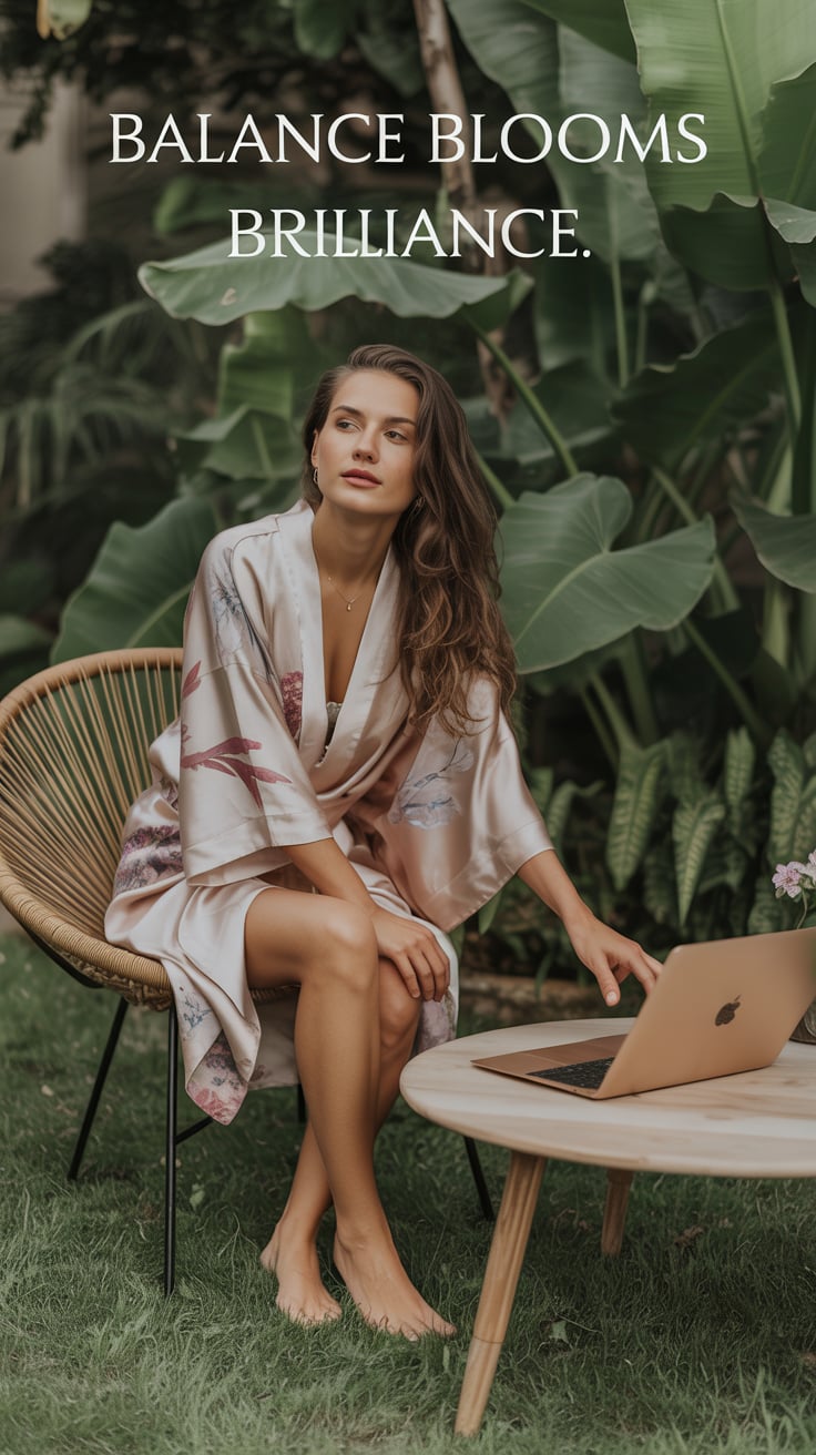 Dreamy lifestyle portrait of a (skin tone) woman barefoot in a garden, silk kimono flowing, laptop a...
