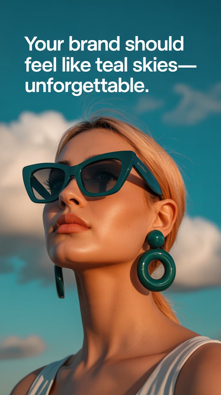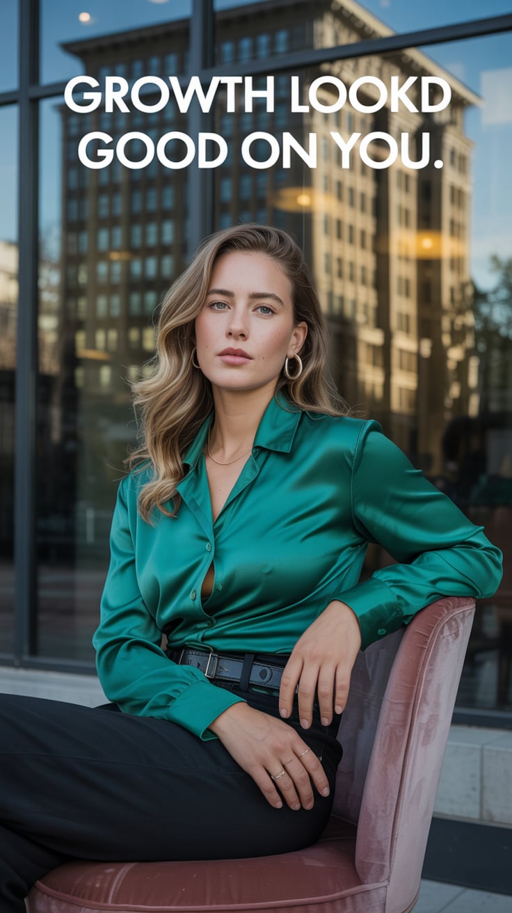 Fashion editorial portrait on teal velvet couch. A (skin color) (age range) (gender/subject) sits ca...