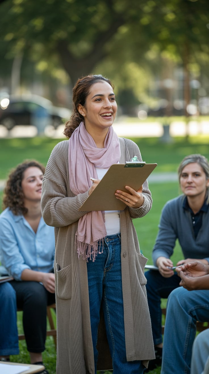 A portrait photograph of a (man/woman/person) in a (setting, e.g., casual outdoor setting / urban ci...