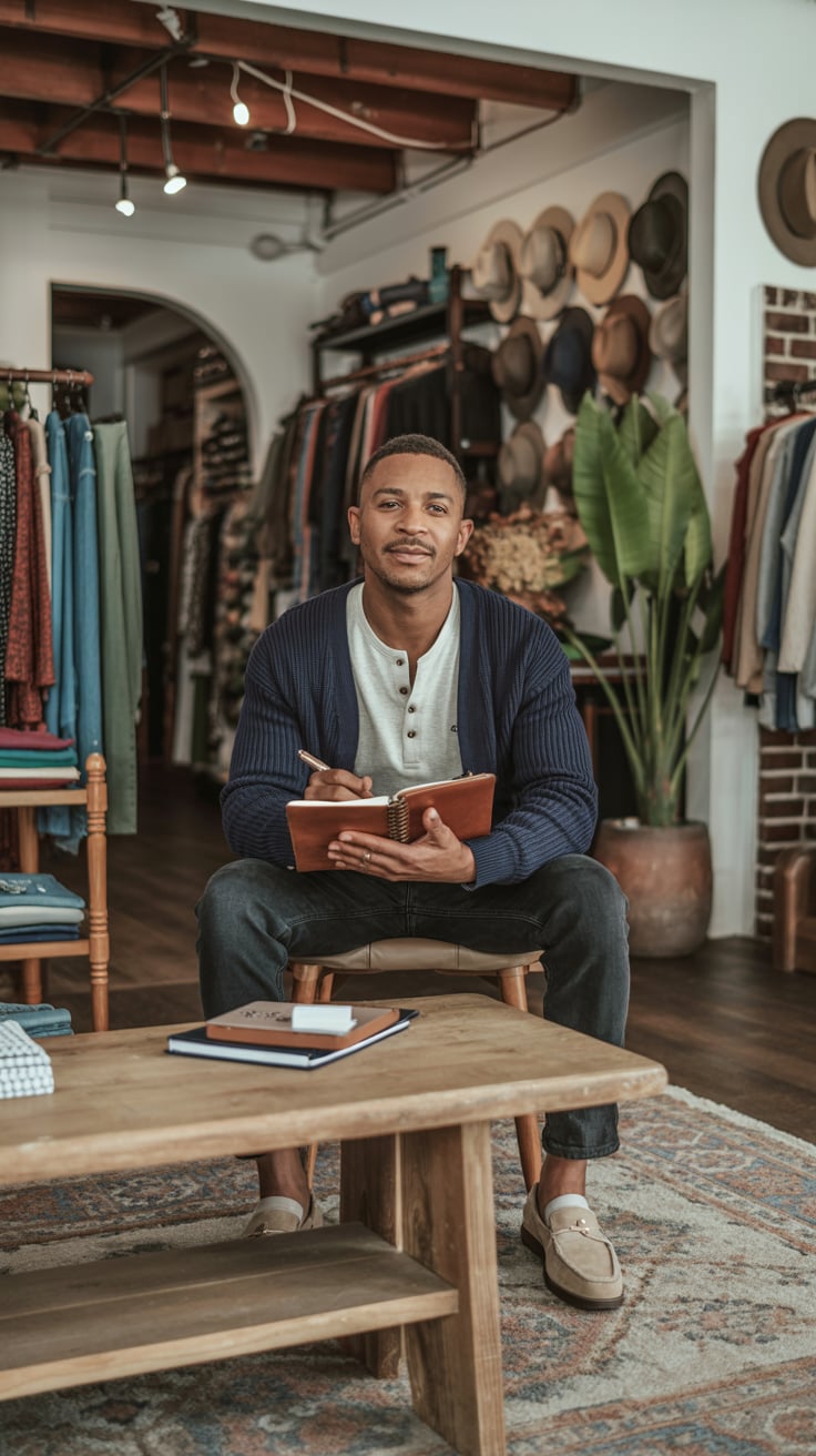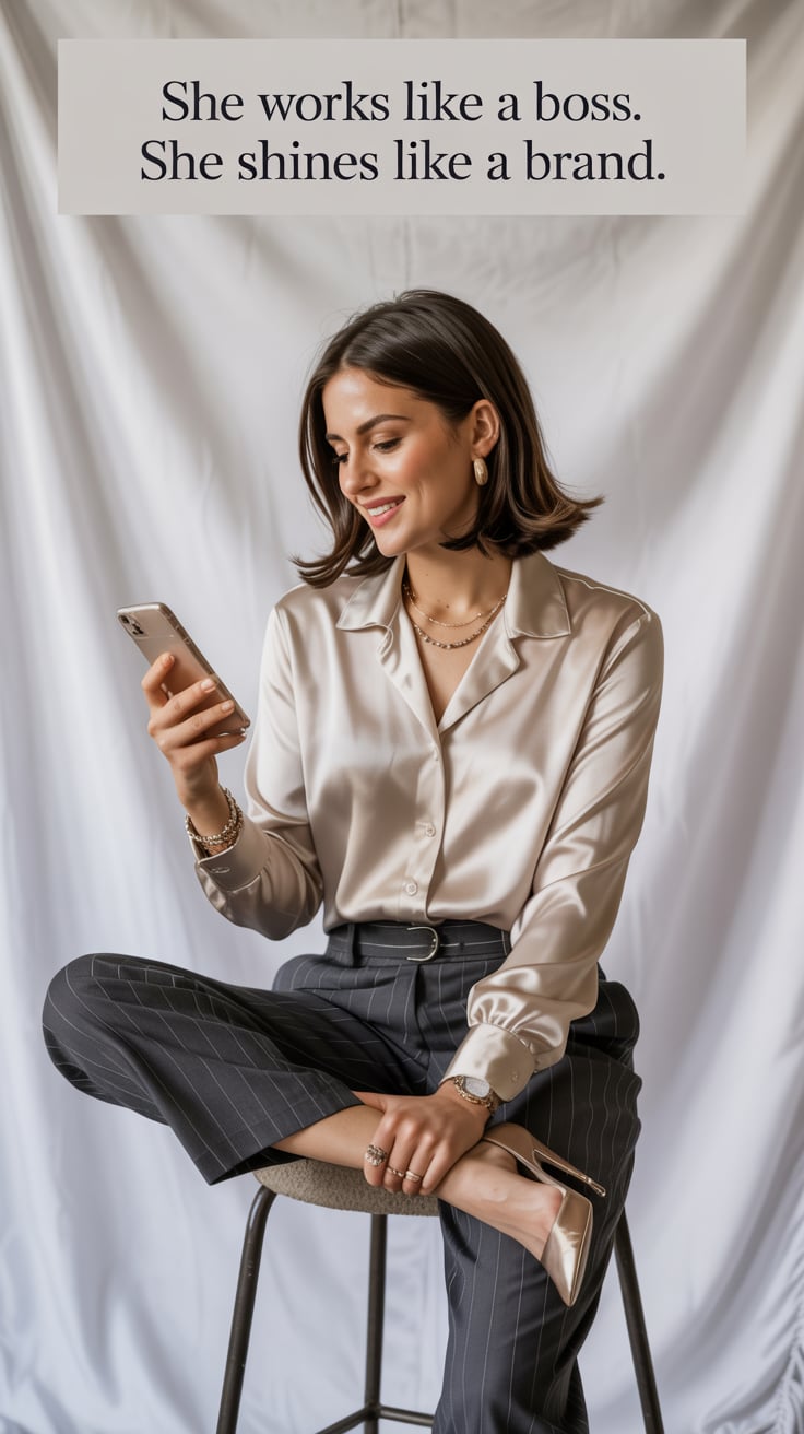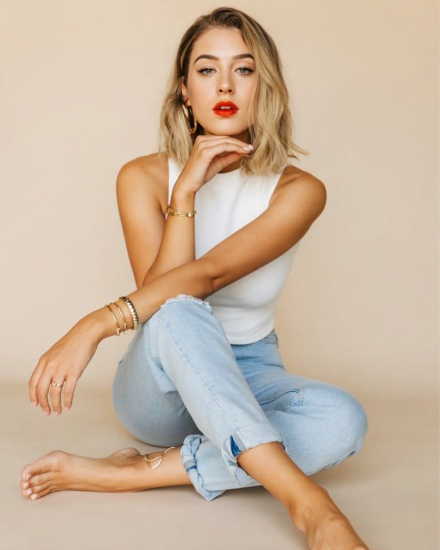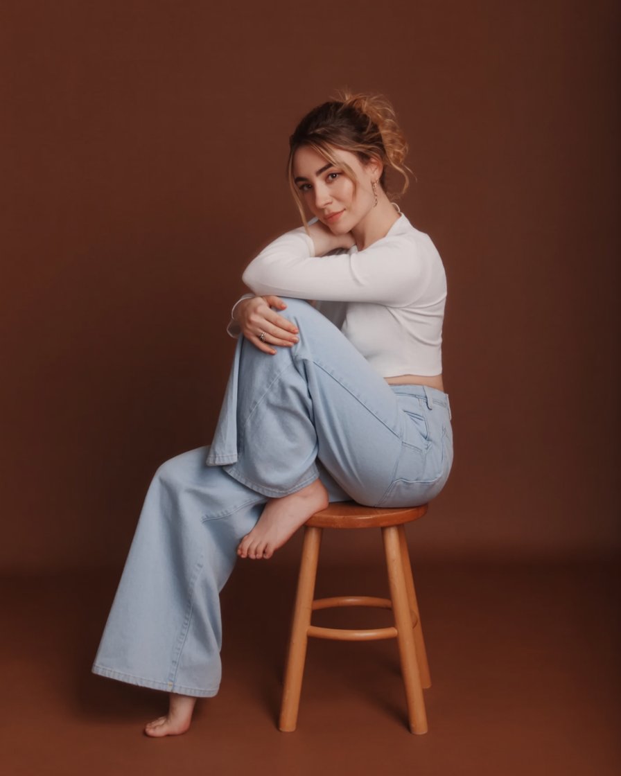 Fashion portrait on a plain backdrop. A (skin color) (age) (gender/subject) sits cross-legged. Outfi...