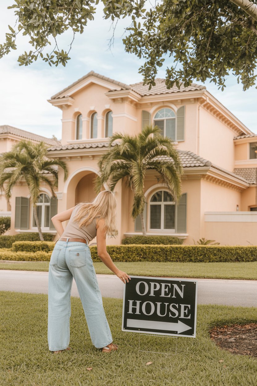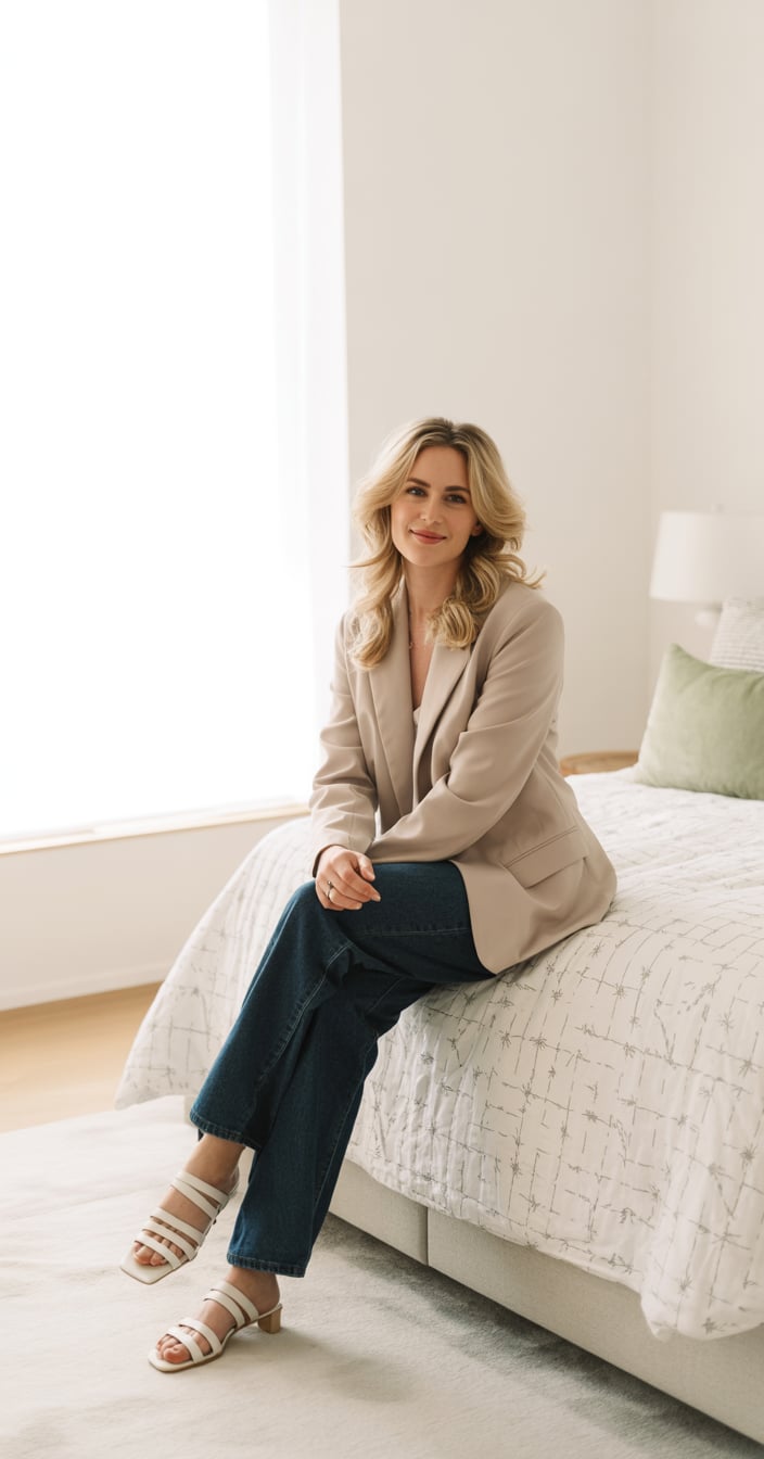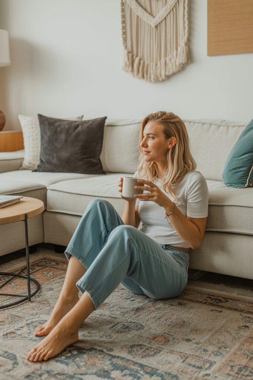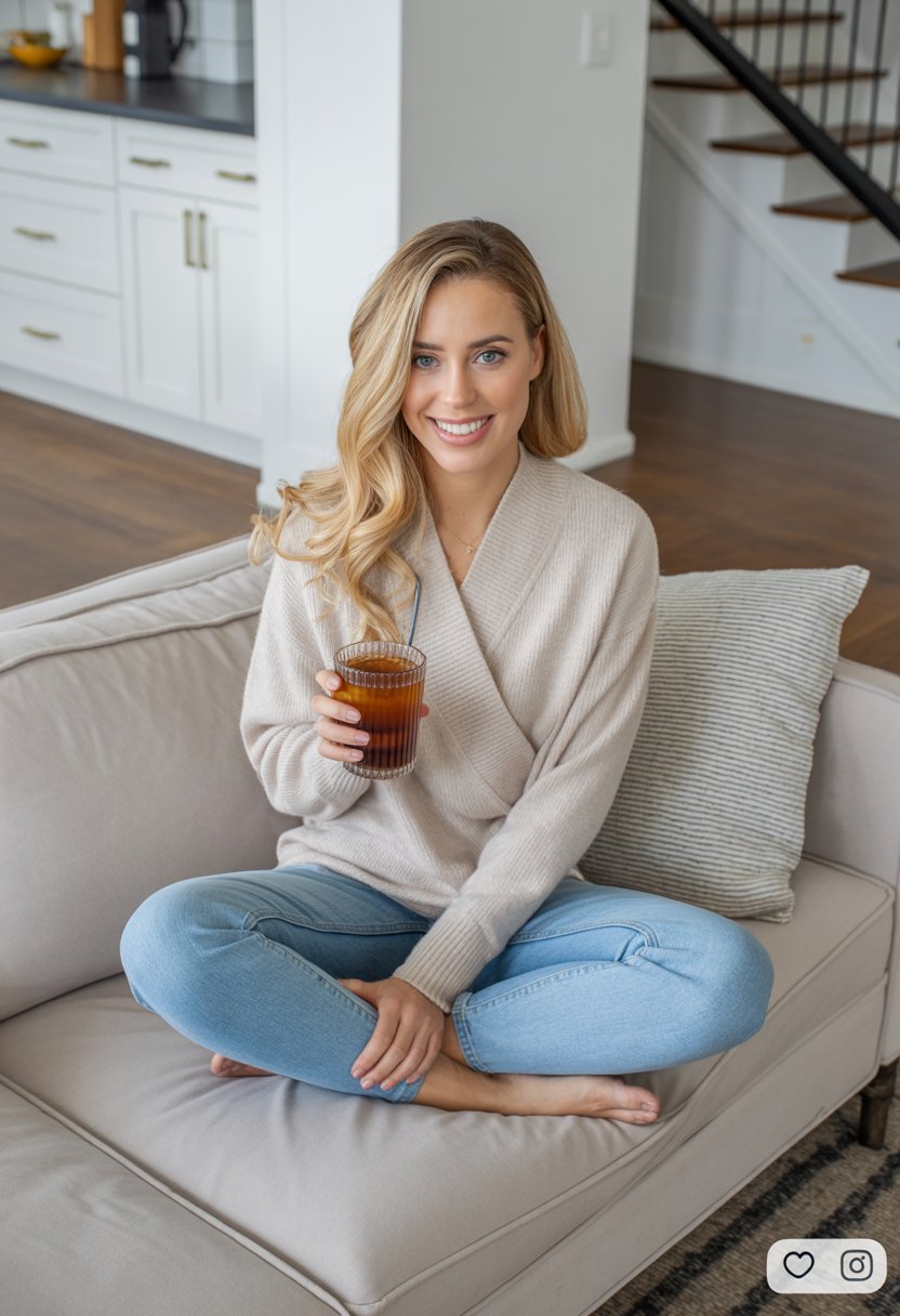 A professional lifestyle photograph of a light-skinned woman sitting casually on a beige sofa in a modern minimalist living room. She is wearing a cream sweater and distressed blue jeans, with long blonde hair styled in loose waves. She is holding a coffee mug while smiling warmly off to the side. The lighting is soft and natural, creating a bright, airy atmosphere. Ultra-realistic, sharp focus, 4k photography.