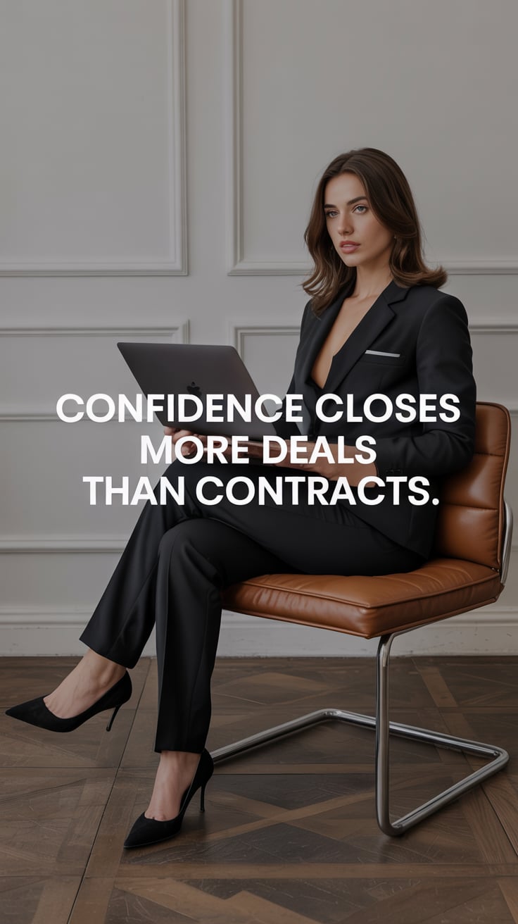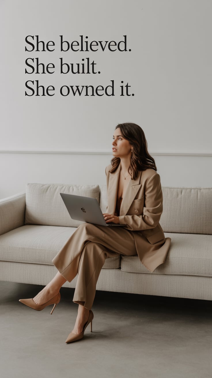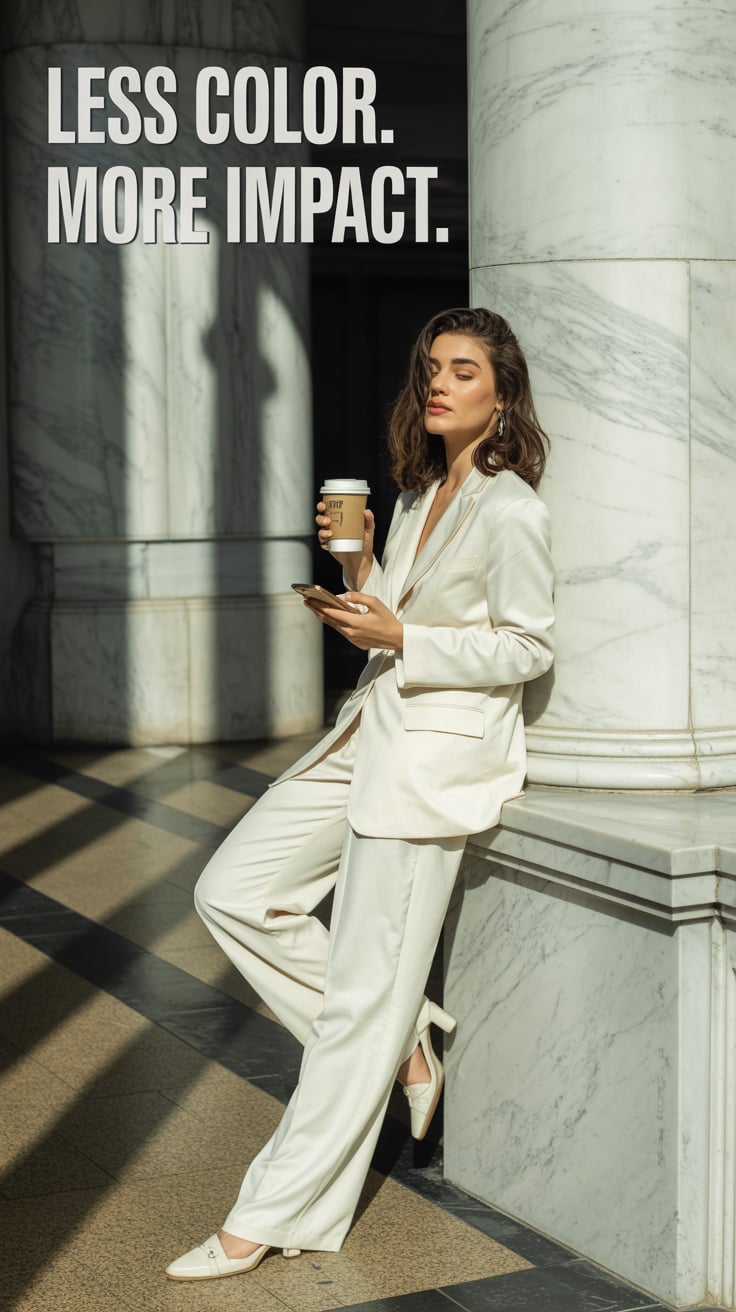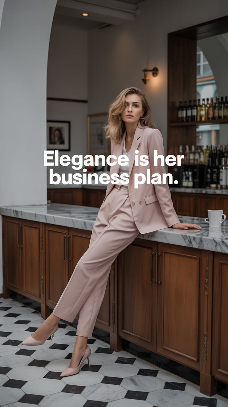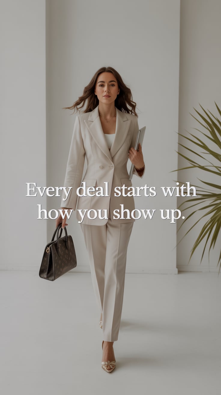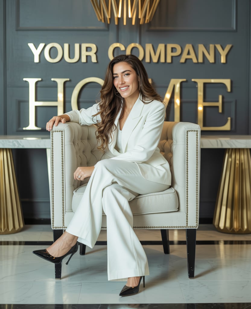High-fashion photo of a (skin tone) female in a chic cream suit with red heels, standing against a w...