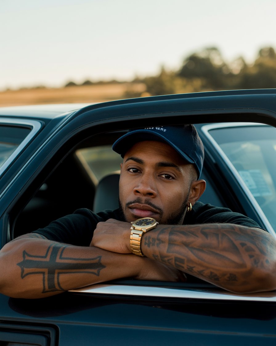 A close-up portrait shot of a (gender/subject) sitting in a (car color: black) car, resting their ar...