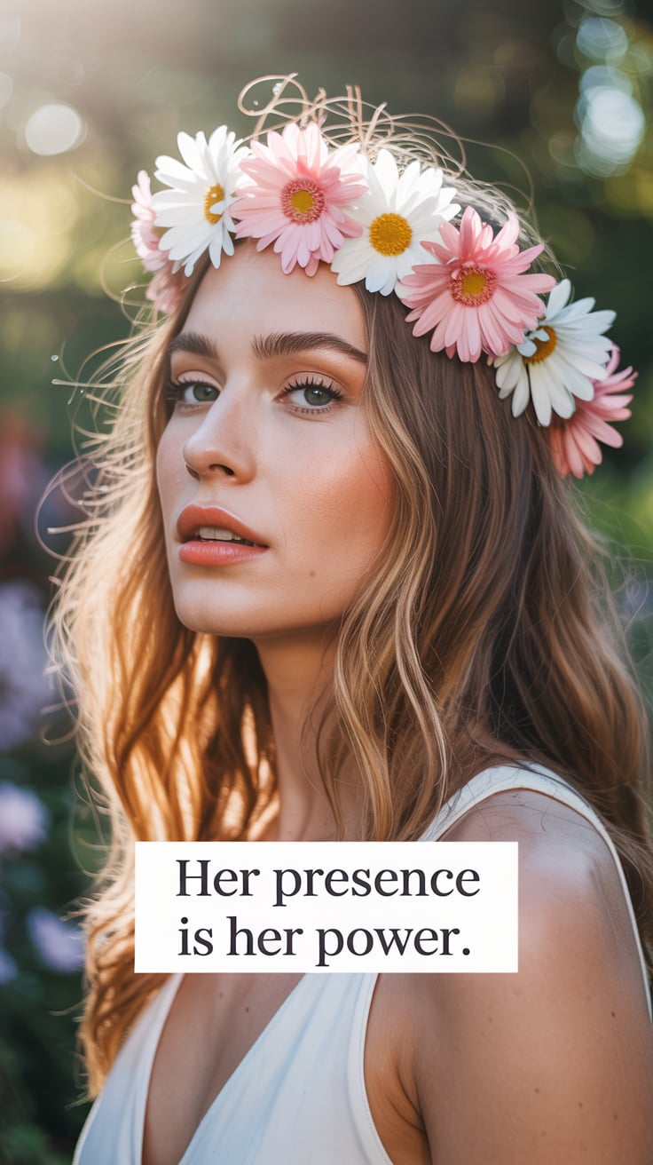 High-fashion close-up of a (skin tone) woman in peach lipstick and flower crown, blurred garden back...