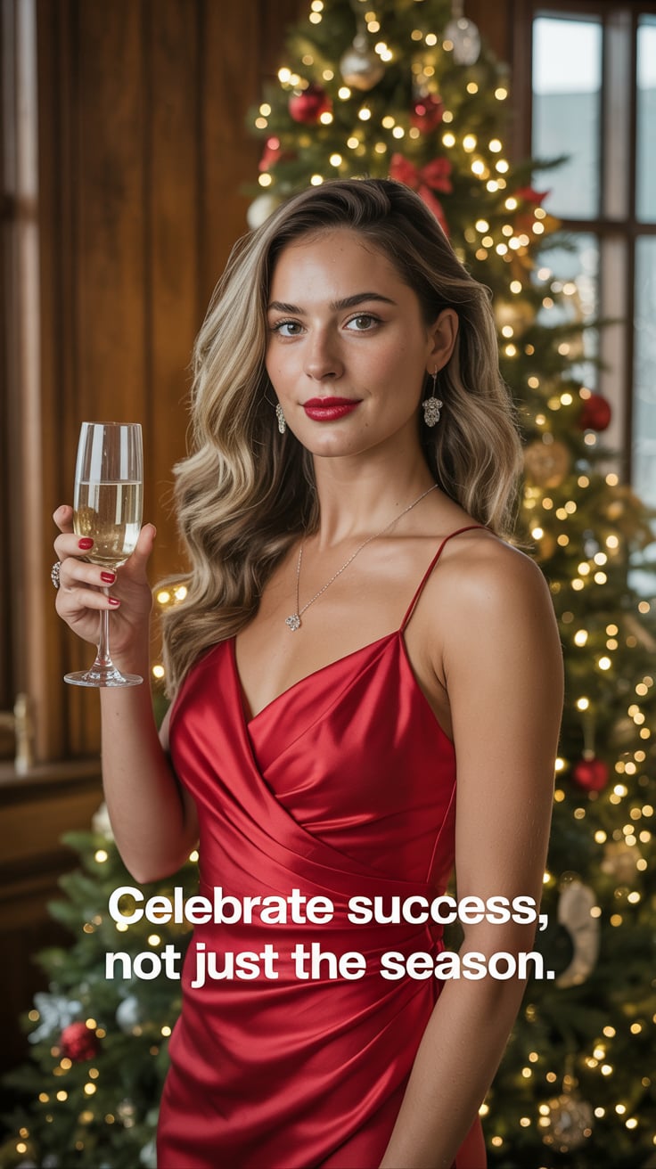 A luxury editorial portrait of a (skin tone) female in a red satin dress, holding a champagne glass ...