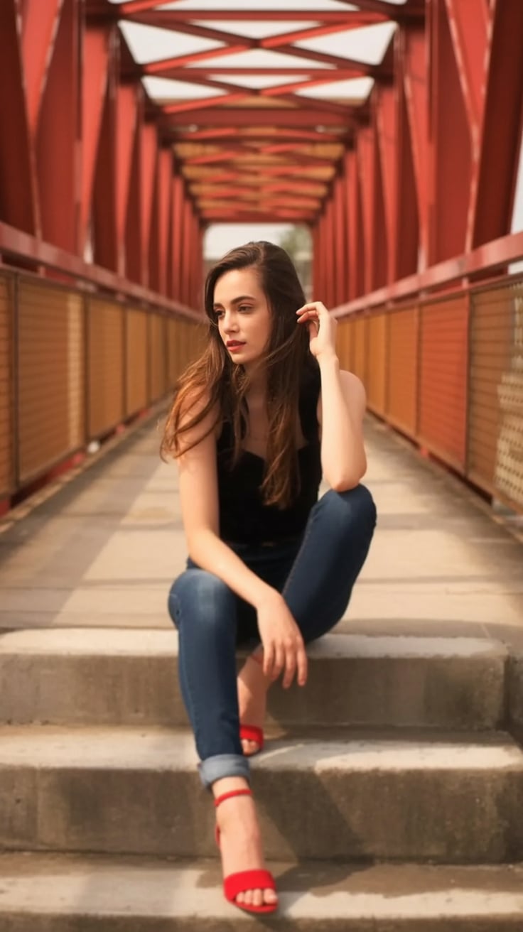 A portrait inside a red industrial bridge tunnel. Subject: (skin color, gender, body shape). Outfit:...