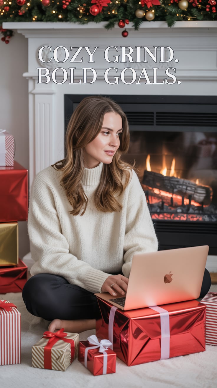 An editorial photo of a (skin tone) female in a cozy cream sweater, seated by a decorated fireplace ...