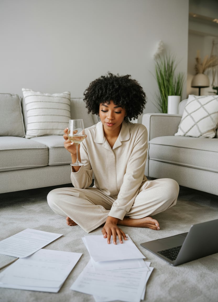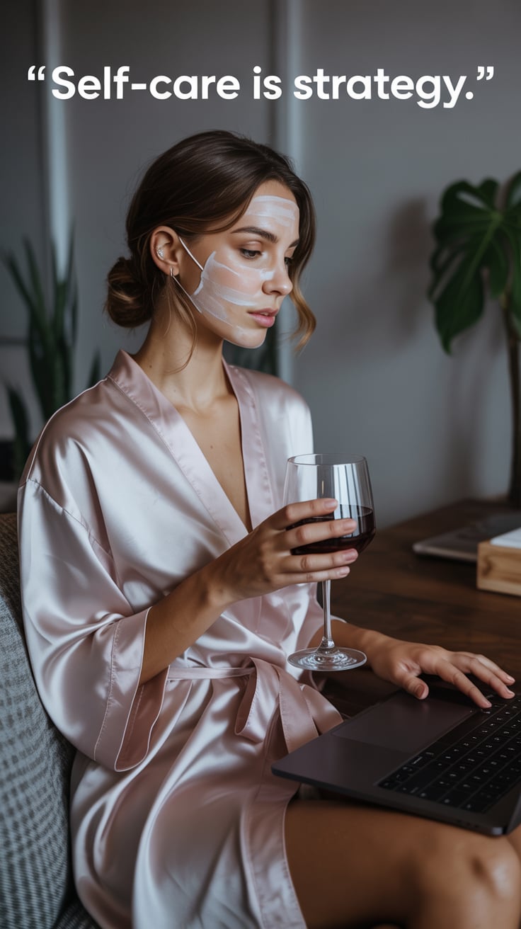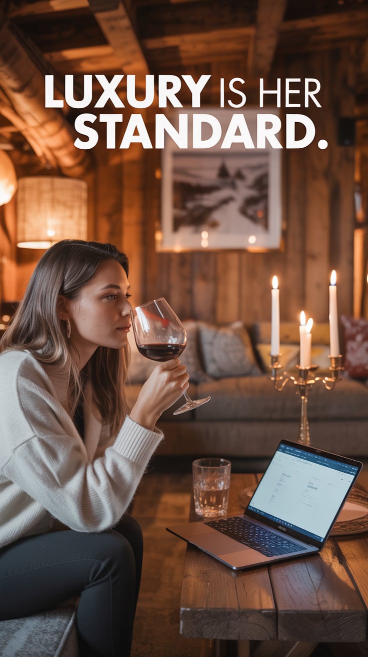 An editorial photo of a (skin tone) female sipping wine in a candlelit chalet lounge, laptop glowing...