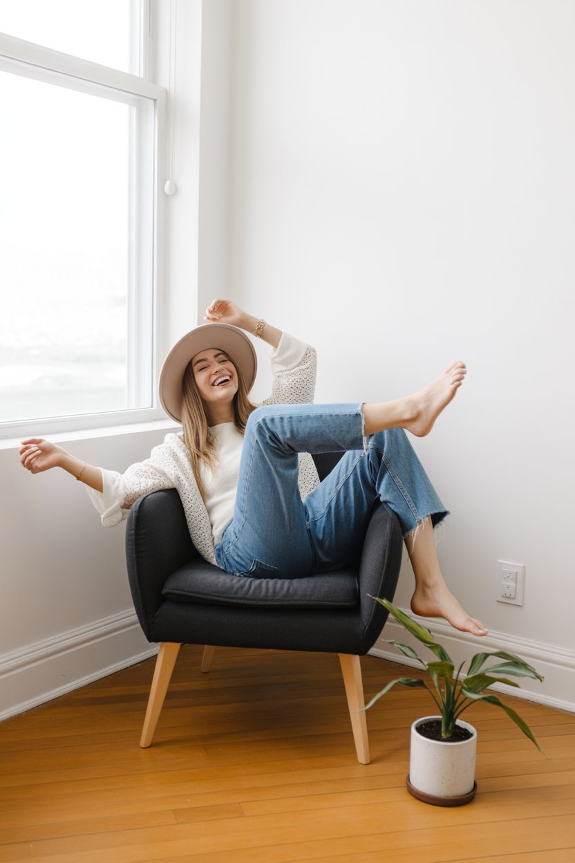 A casual indoor portrait of a (skin color) (gender/subject) with a (body shape: curvy, slim, athleti...
