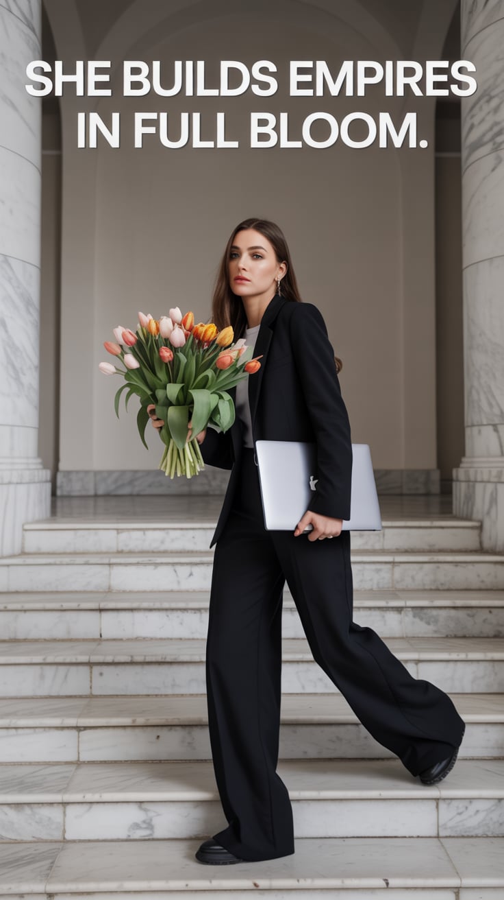 High-fashion editorial of a (skin tone) woman holding a bouquet of tulips in one hand and a laptop i...