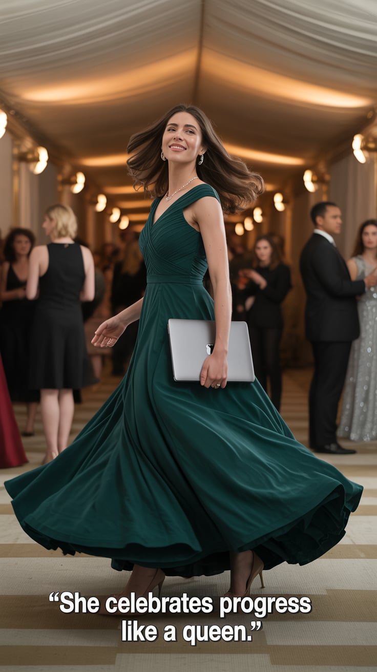A dreamy wide shot of a (skin tone) female in a floor-length emerald gown, twirling in a decorated b...