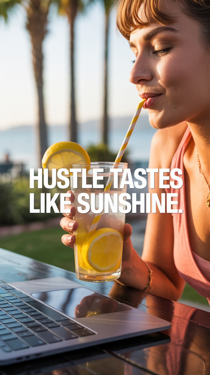 Luxury indoor photo of a (skin tone) woman with a slick ponytail, laptop on a marble table, iced wat...