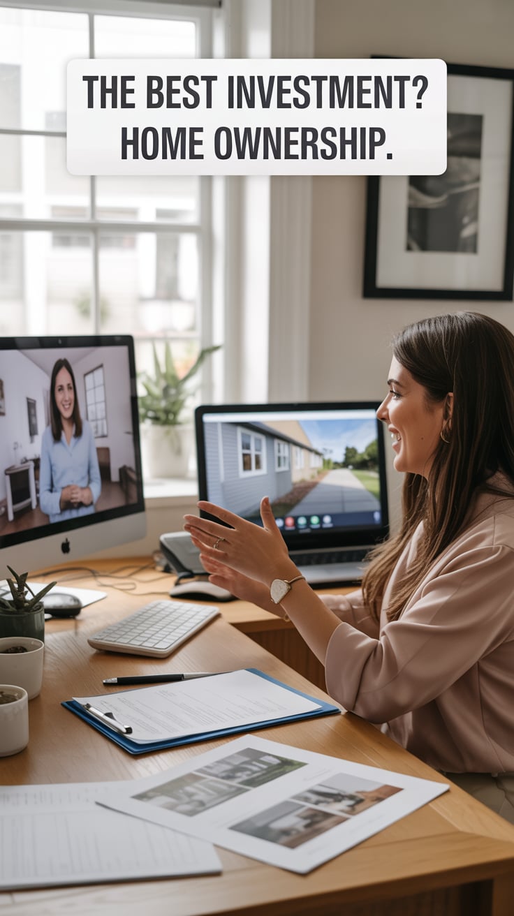 A bright home office lifestyle photo. A (skin color) (gender/subject) with a (body shape) sits at a ...