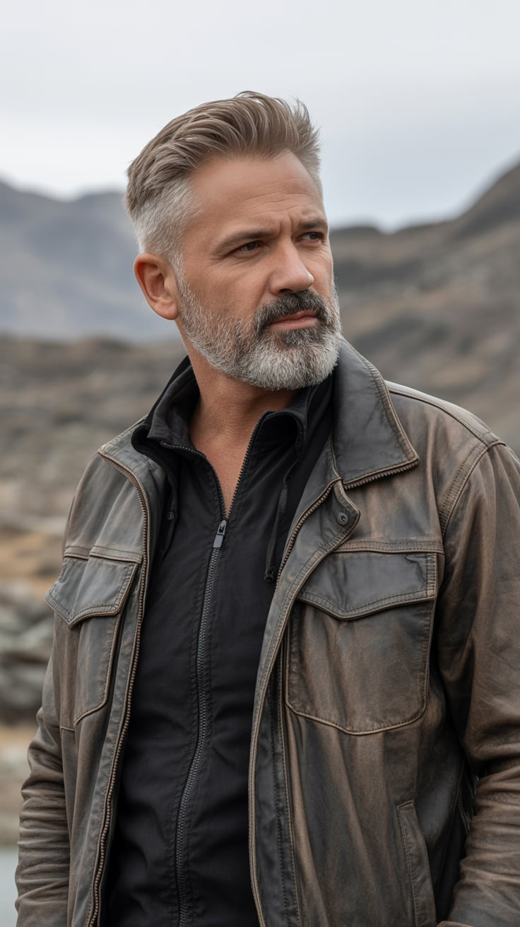 A fitness and outdoor adventure photograph of a (gender/subject) with a (hair color: dark) beard and...