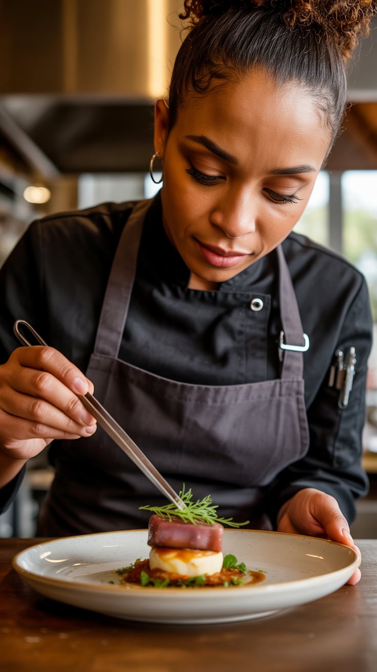 Editorial portrait of a (skin tone) female in a cozy camel sweater, seated at a rustic dining table ...