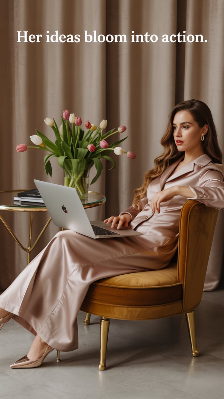 Luxury fashion image of a (skin tone) woman reclining on a velvet chair, a vase of fresh tulips besi...