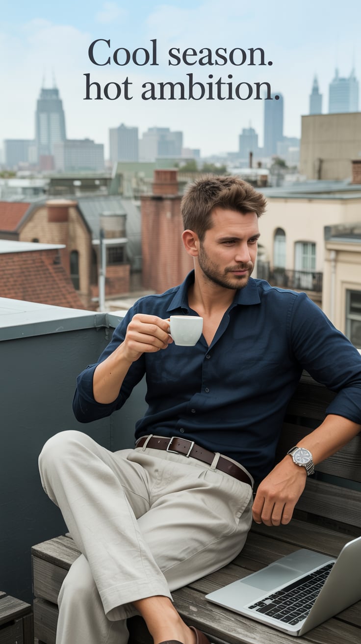 Editorial rooftop shot of a (skin tone) man in rolled sleeves and linen trousers, sipping espresso w...