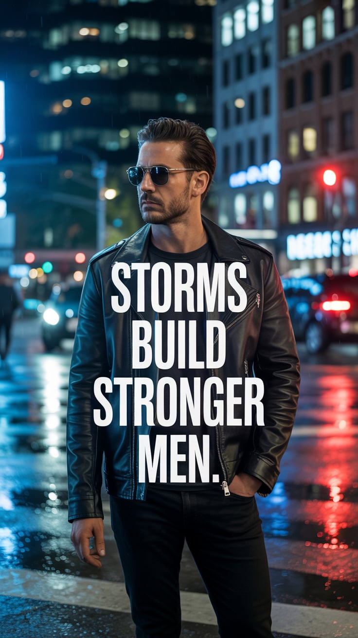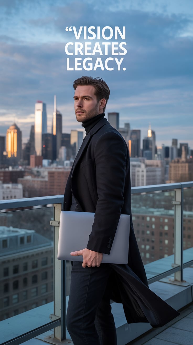 A cinematic rooftop portrait of a (skin tone) male in a charcoal coat and scarf, laptop bag at his s...
