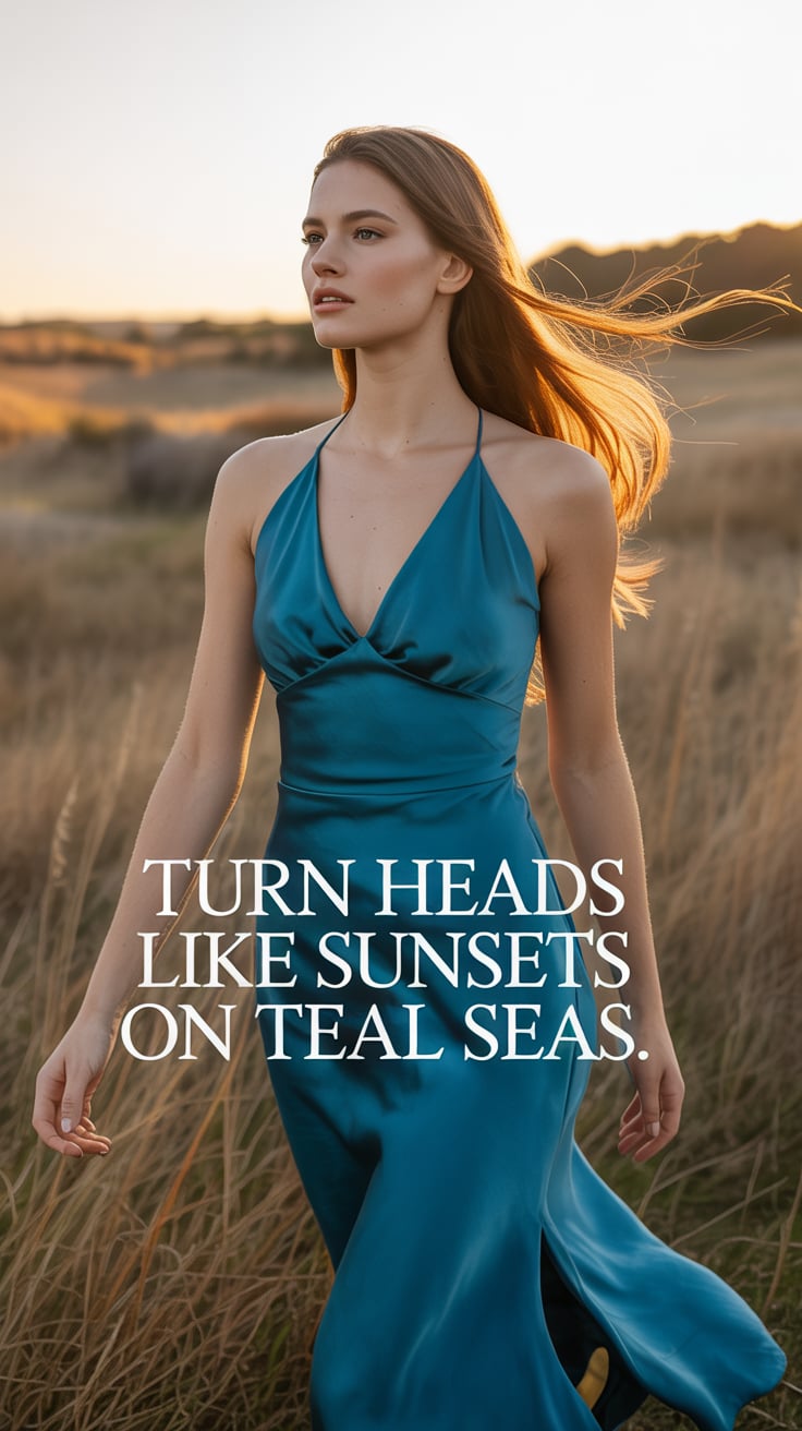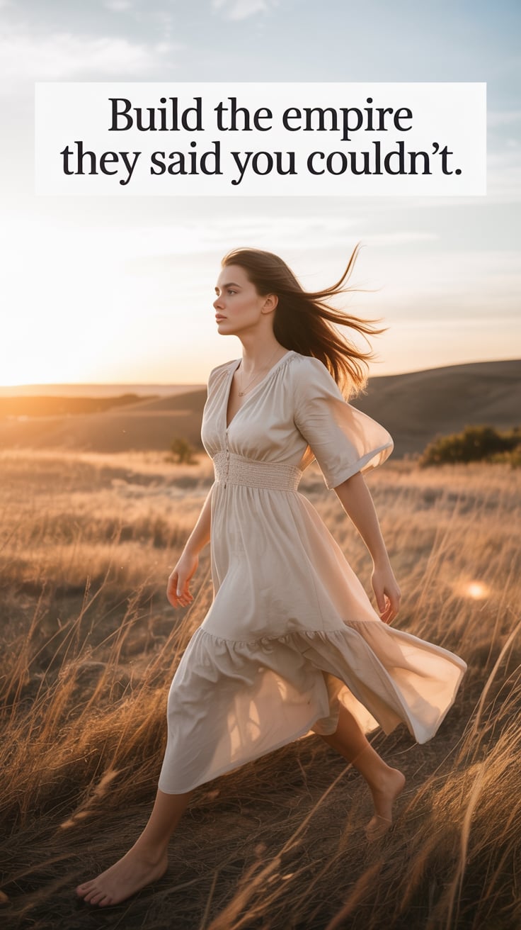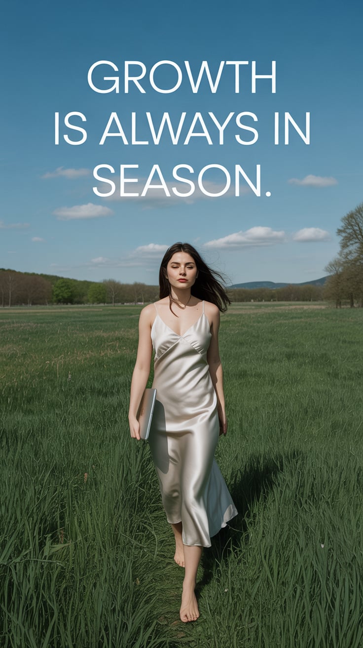 Cinematic wide shot of a (skin tone) woman walking barefoot through tall spring grass in a silk dres...