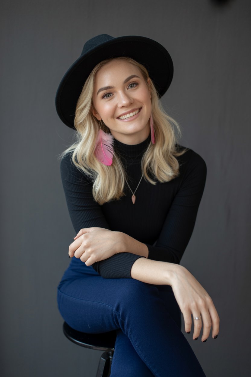 A professional studio portrait of a (skin color) (age range) (gender/subject) with (hair color), (hair length), (hair style), wearing (outfit description), sitting in a (pose description).