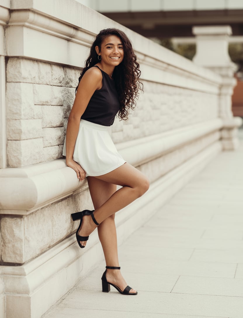 A professional fashion photograph of a (skin color) (gender/subject) sitting on a concrete ledge aga...