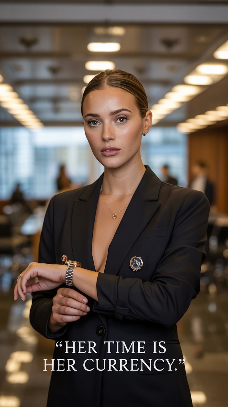 A high-fashion wide shot of a (skin tone) female striding across a luxury hotel lobby in heels and a...