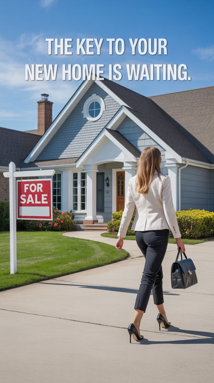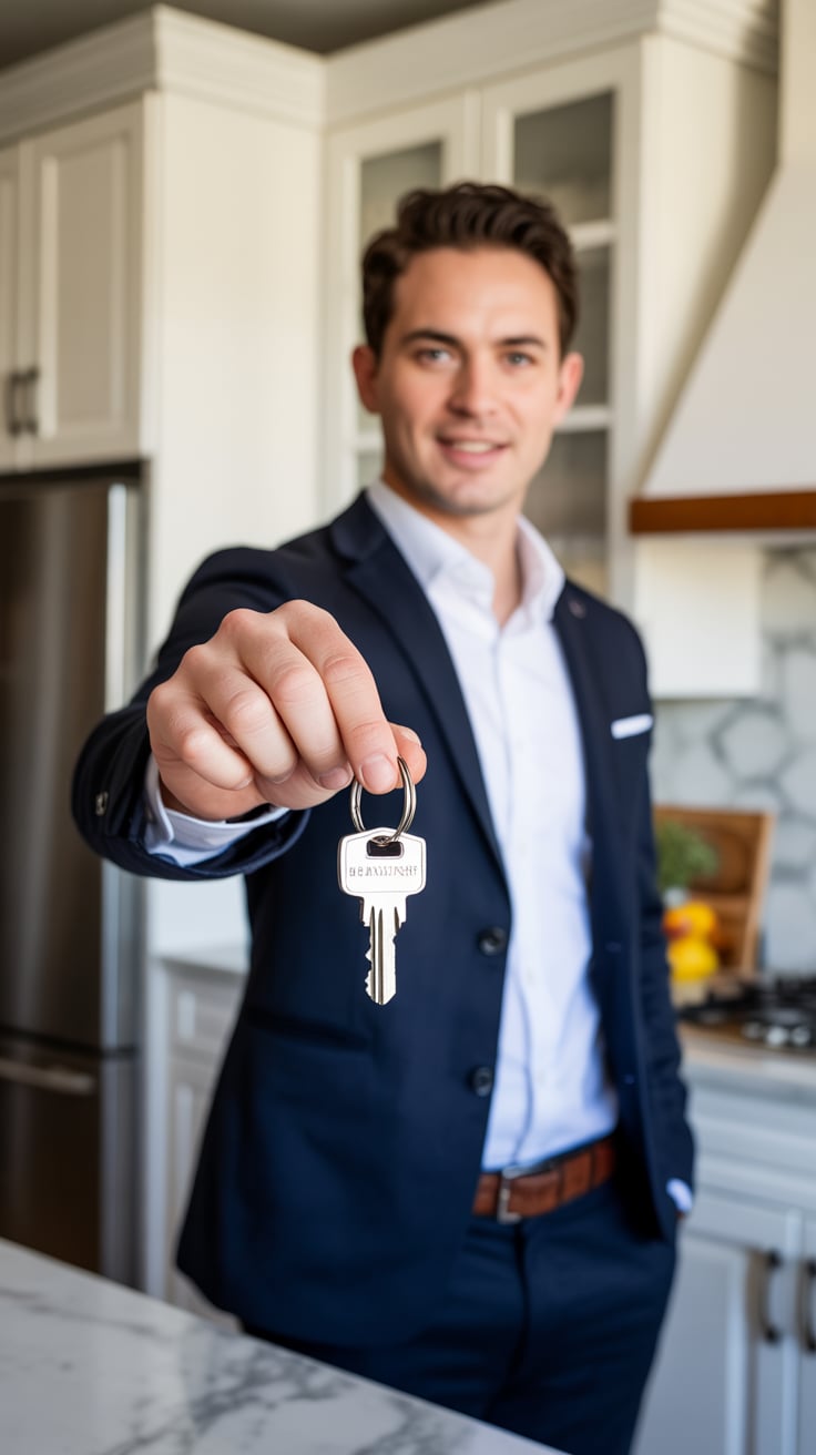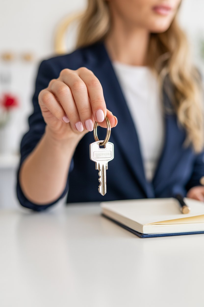 A close-up photograph of a (skin color) hand holding a (key material: silver) house key on a (keycha...