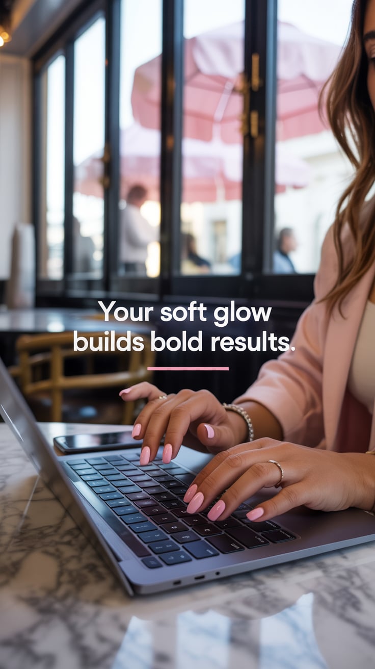 A dreamy editorial close-up of a (skin tone) female’s hands with metallic nails typing on a laptop, ...
