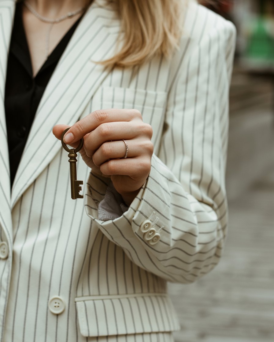 A close-up photograph of a (skin color) hand holding a (key material: brass) key against a (blazer p...