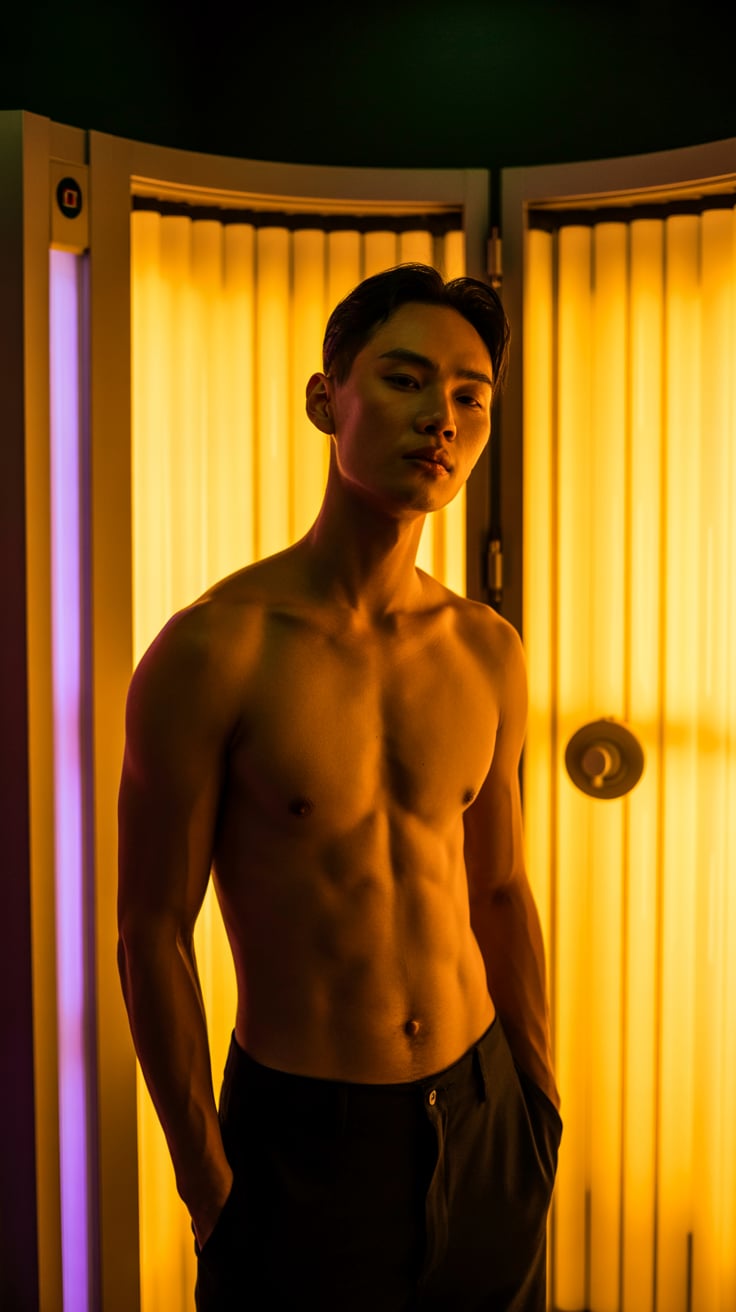 A professional lifestyle photograph of a (skin color) (age range) (gender/subject) with a (body shap...