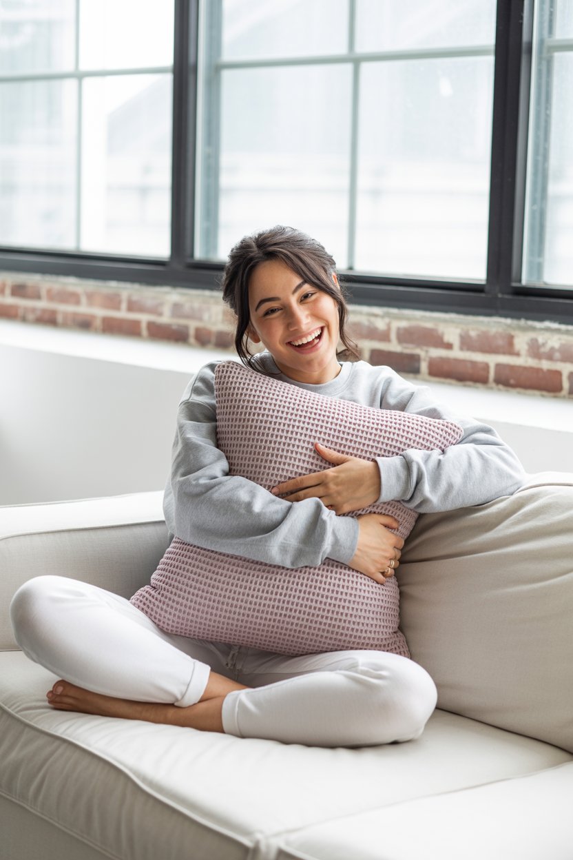A bright indoor lifestyle photo of a (skin color) (gender/subject) on a (linen couch / sectional) ne...