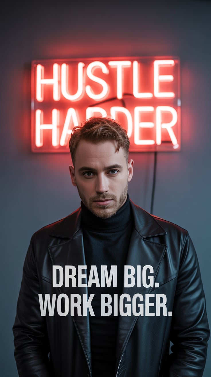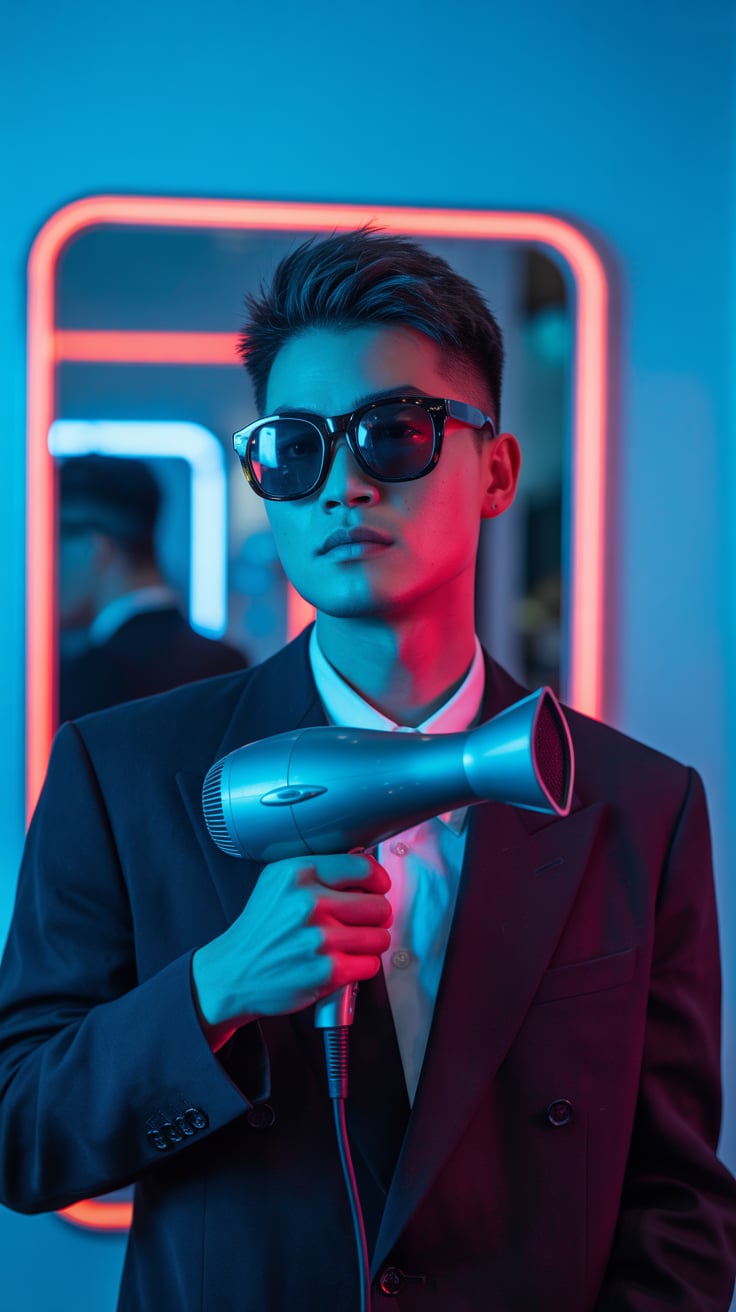 A professional portrait photograph of a (gender/subject) in a dark industrial setting. The subject w...