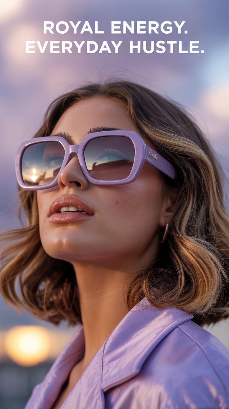 Fashion-inspired close-up of a (skin tone) female with bold dark lipstick and oversized sunglasses, ...