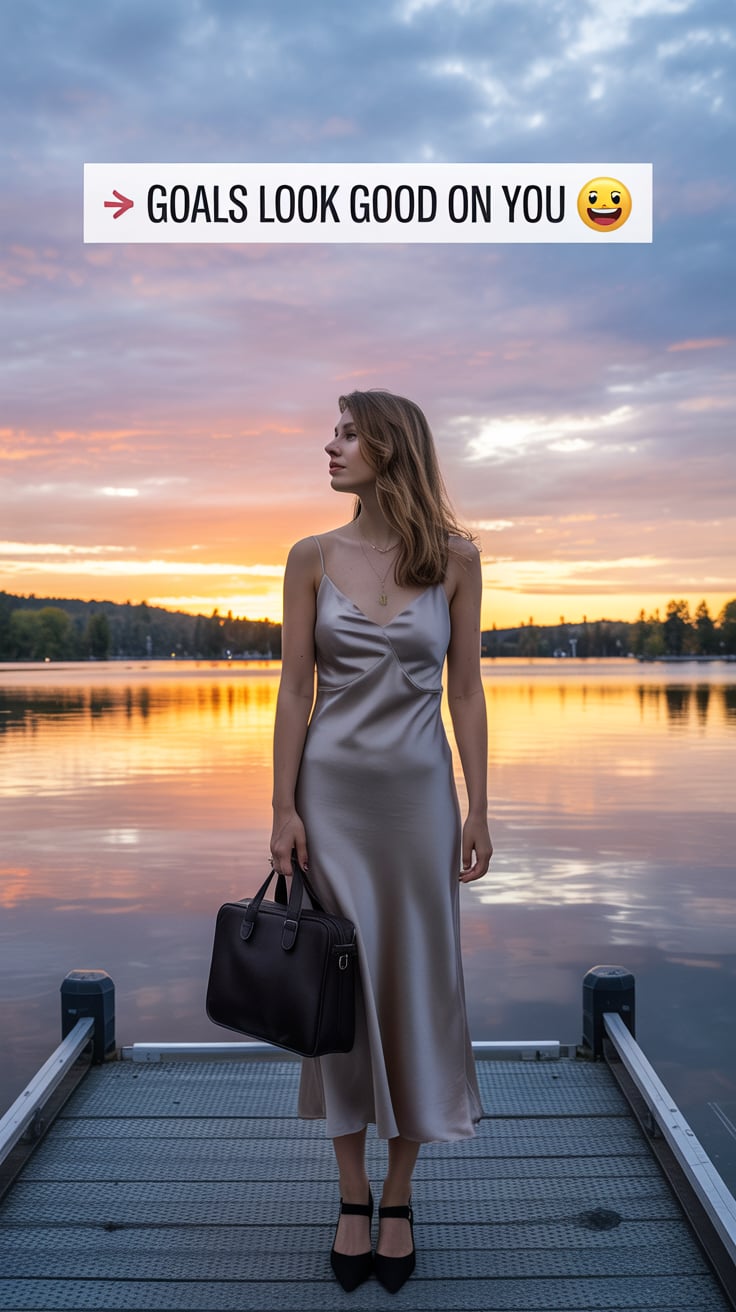 Editorial portrait of a (skin tone) female in a chic black satin dress, standing under moody streetl...