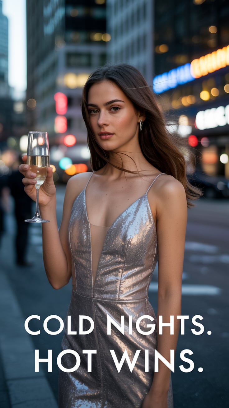 Cinematic rooftop party shot of a (skin tone) woman in a sequin mini-dress, holding a champagne glas...