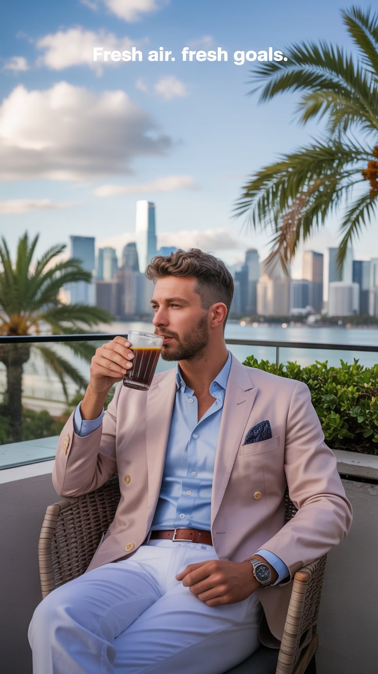 Luxury terrace photo of a (skin tone) man in a pastel blazer, sipping iced coffee with palm trees an...