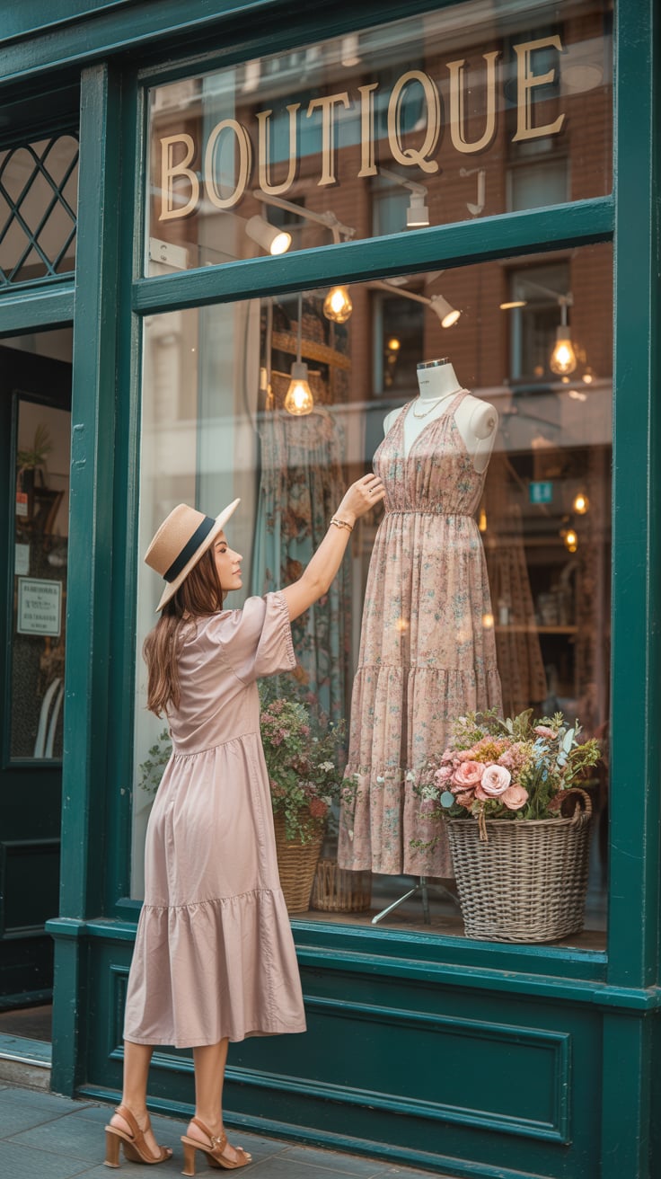 Easter theme: Lifestyle portrait of a (skin tone) woman in a pastel dress at an outdoor café with tu...
