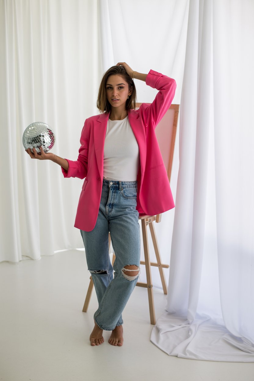 A professional studio portrait against a pastel pink backdrop. A (gender/subject) is wearing a (outf...