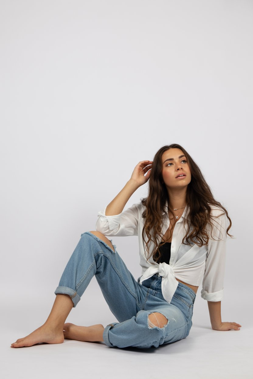 A casual studio floor portrait. Subject: (skin color, gender, body shape). Outfit: (white long-sleev...
