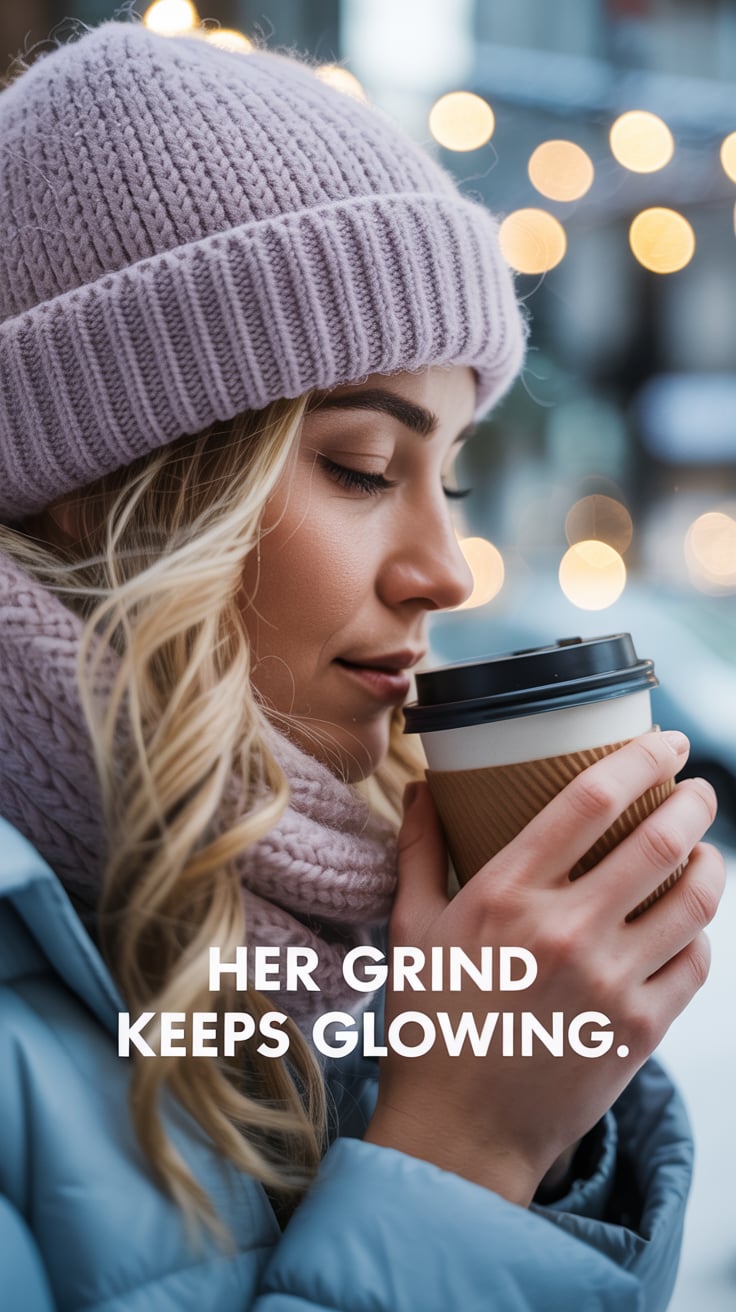 A dreamy close-up of a (skin tone) female in a soft knit hat and scarf, sipping coffee from a to-go ...