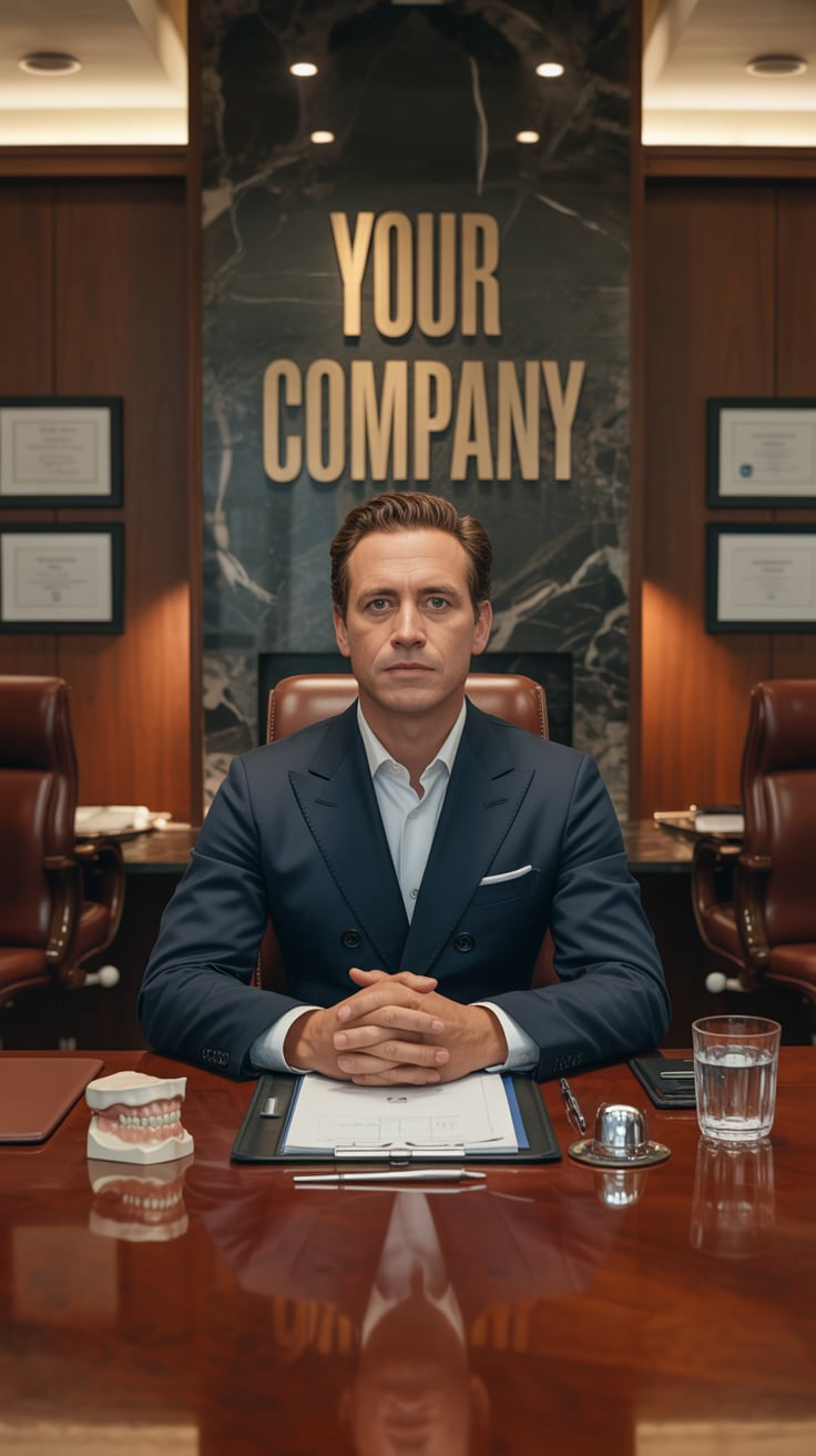 A professional portrait photograph of a (gender/subject) in a (suit color: dark navy) suit jacket an...