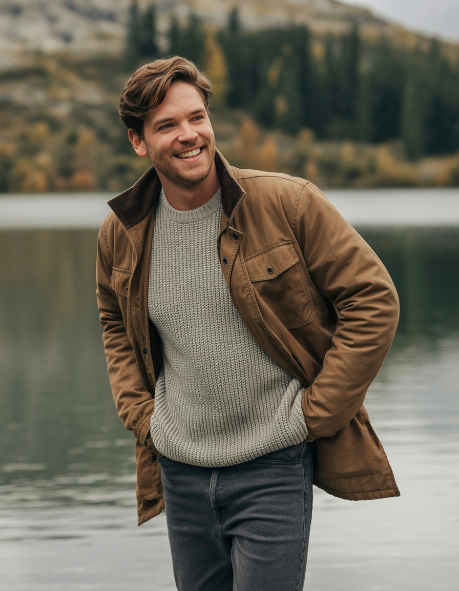 A lifestyle photography shot of a (gender/subject) standing by a lake on an overcast day. They are w...